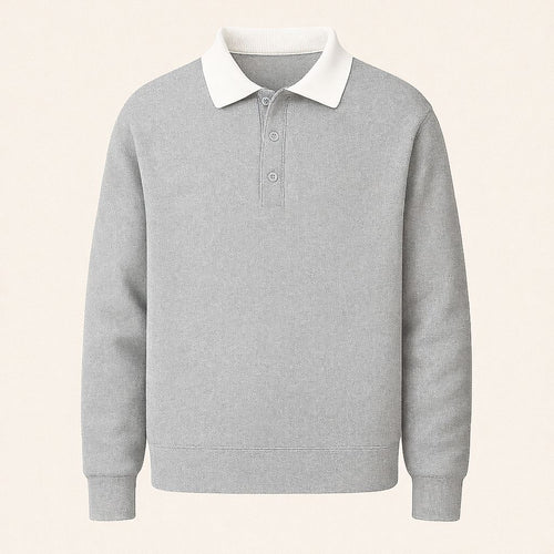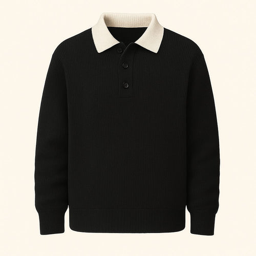 A refined knit polo sweater designed for effortless everyday wear. Featuring a soft textured knit, contrast collar, and clean button placket, it offers a polished look with natural stretch and comfort. Finished with ribbed cuffs and hem, this versatile piece is ideal for smart-casual styling or easy layering.